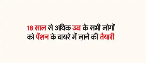 नई दिल्ली। सरकार 18 साल से अधिक उम्र के सभी लोगों को पेंशन के दायरे में लाने की तैयारी कर रही है। यूनिवर्सल पेंशन योजना में सभी तरह के कामगारों को पेंशन मिलेगी। इसमें संगठित और असंगठित दोनों क्षेत्र के कर्मचारी शामिल होंगे। फिलहाल, असंगठित क्षेत्र के लोगों जैसे निर्माण श्रमिक, घरेलू कर्मचारी और दिहाड़ी श्रमिक सरकार की किसी भी पेंशन के दायरे से बाहर हैं। यह योजना स्वैच्छिक और अंशदायी होगी। रोजगार से बंधी नहीं होगी। इसलिए, योजना हर किसी के लिए योगदान और पेंशन अर्जित करने के लिए खुली होगी।