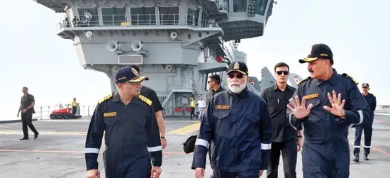 Prime Minister had an extensive set of engagements on board the indigenously built aircraft carrier. He toured the flight deck, surrounded by MiG-29K fighters, and witnessed an air power demonstration showcasing the jets’ day and night operations. PM Modi also attended a cultural programme in which Navy personnel performed songs, including the one especially composed to commemorate the success of Operation Sindoor.