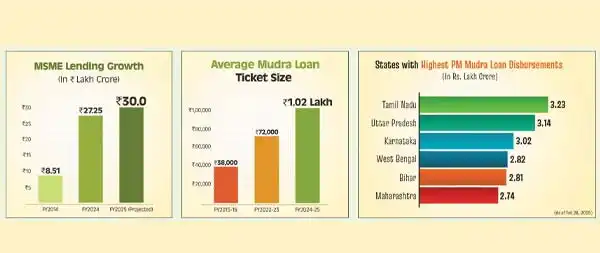 An SBI report highlights a significant rise in credit flow to MSMEs, driven by Mudra’s impact. MSME lending surged from Rs 8.51 lakh crore in FY14 to Rs 27.25 lakh crore in FY24, and is projected to cross Rs 30 lakh crore in FY25. The share of MSME credit in total bank credit increased from 15.8 per cent in FY14 to nearly 20 per cent in FY24. This expansion has enabled businesses in smaller towns and rural areas to access financial support that was previously unavailable, strengthening India’s selfreliant economy and driving grassroots job creation.