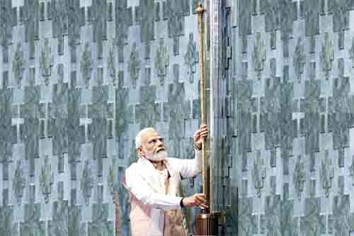 The PM unveiled a plaque to mark the inauguration of the new building. He also installed the sacred ‘Sengol’ in the Lok Sabha chamber, next to the Speaker’s chair, after performing puja. He was handed over the historic ‘Sengol’ by Adheenams before it was installed in the new Parliament building.