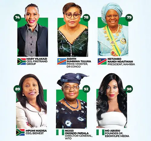 On 21 March 2025, Netumbo NandiNdaitwah was sworn in as Namibia’s first female president. Mpumi Madisa is the first Black woman to lead a top-40 Johannesburg Stock Exchange-listed company. Ngozi Okonjo-Iweala of Nigeria, one of the world’s top economists, has served as World Bank fundraiser, Gavi chair, and co-chair of the Global Commission on Economy and Climate. Mo Abudu is a Nigerian media entrepreneur and founder of EbonyLife Media, shaping African storytelling globally.