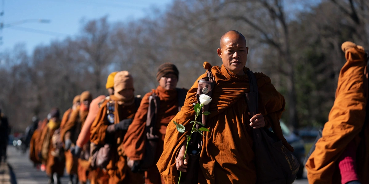 The monks began their 108-day journey on October 26, 2025, from the Huong Dao Vipassana Bhavana Centre in Fort Worth, Texas. Wearing saffron and maroon robes, they walked through winter storms and along icy sidewalks, accompanied by a rescue dog named Aloka.